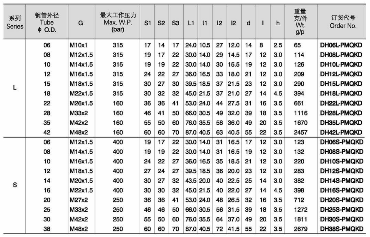 不带螺母和卡套时的订货代号示例:DH10L-PMQKDX