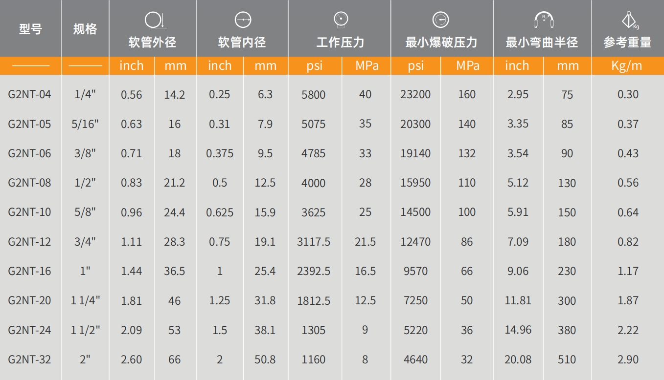 G2NT系列使用通用的两层钢丝编织结构,,,以顺应全球客户的要求,,,其制造切合严酷的国际质量规范要求,,,为客户提供一致性的性能,,,该系列胶管提供了高事情压力,,,长使用寿命和普遍的流体兼容性。。。