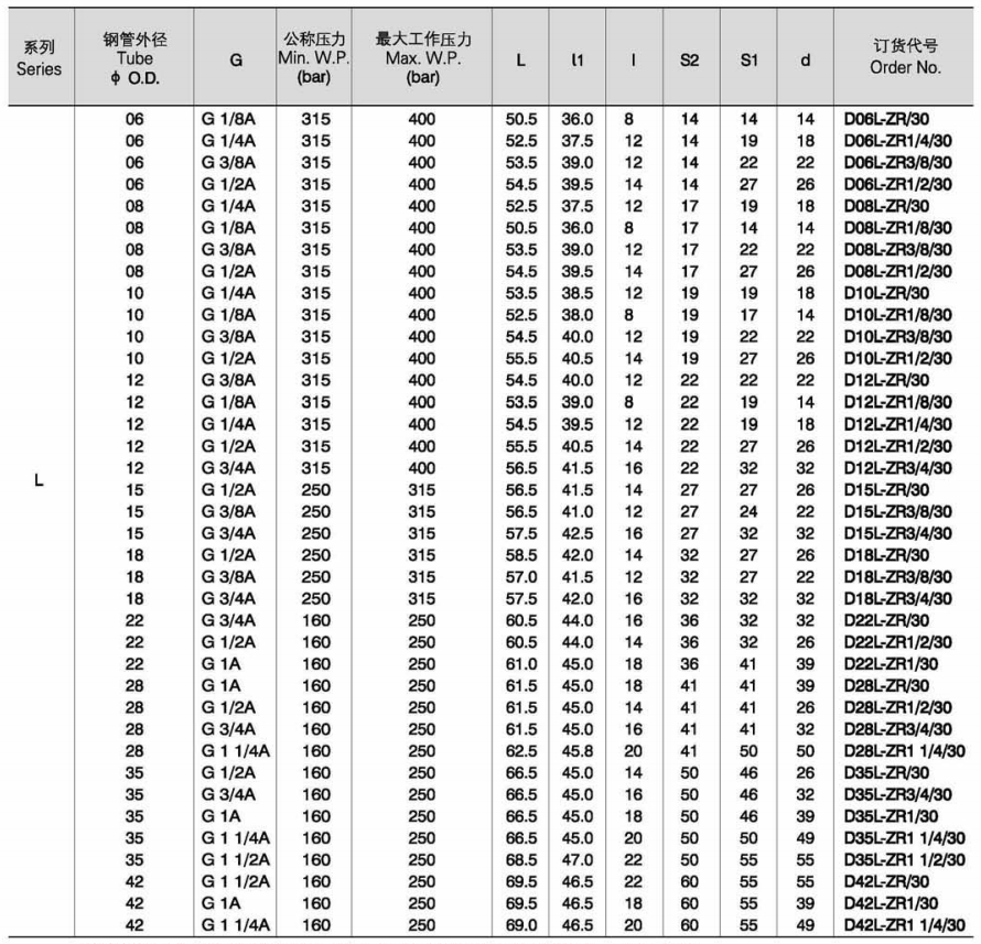 不带螺母和卡套时的订货代号示例:D10S-ZR/40X)
